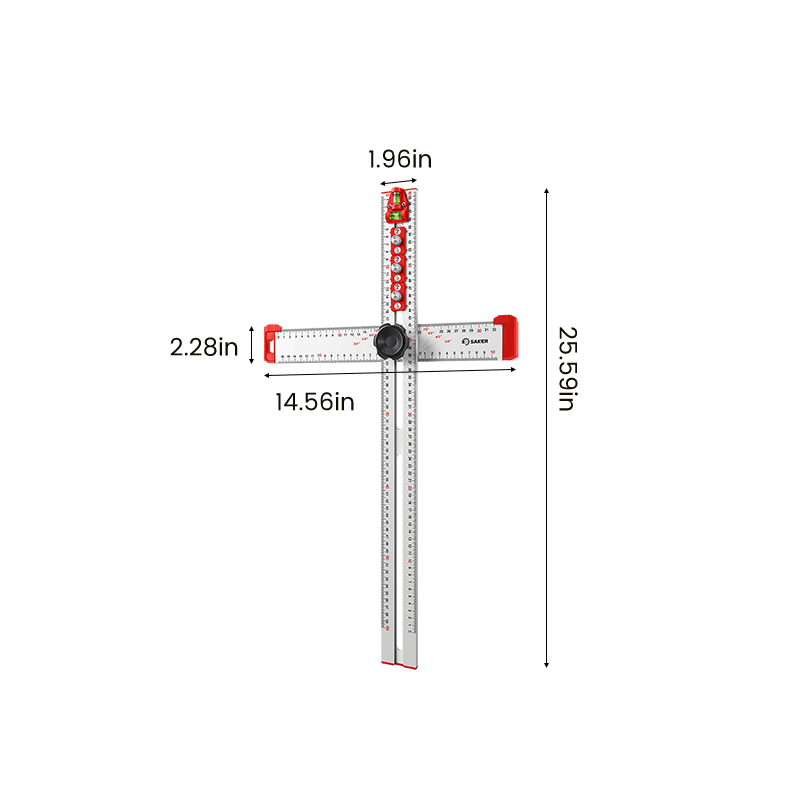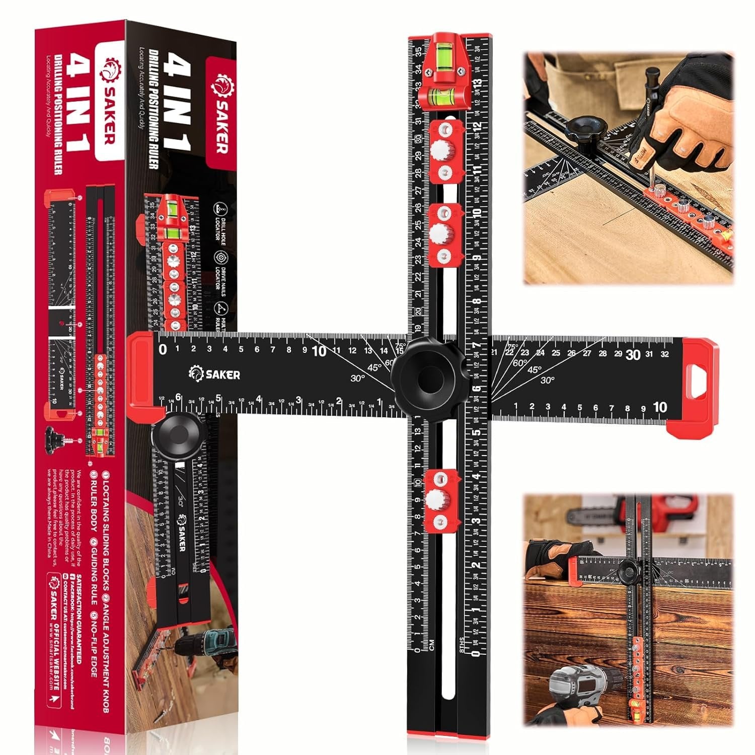 The SAKER® 4 in 1 Drilling Positioning Ruler optimizes drilling, nailing, and marking tasks with adjustable positioning blocks for swift and precise hole alignment. Its dual-axis bubble levels ensure accurate horizontal and vertical alignments, even on uneven surfaces.