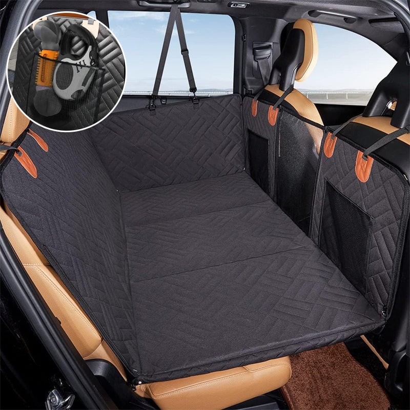 Side flaps, mesh windows, storage pockets and seat belts: The side wings protect the doors from scratches. The dog seat cover comes with a breathable, clear mesh window that allows you and your furry friend to see and hear each other, alleviating any stress or anxiety. This dog hammock for car also features a large capacity storage pocket for your dog's toys and treats. The dog seat belt protects your dog from the dangers of moving around in the car.